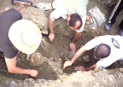 The third royal cluster is known as the Teminids cluster where 12 tombs, with dates ranging from 570 to 300 BC, have come to light: five pits, six monumental cists, and a Macedonian tomb. Next to and around two of the earliest tombs were the remains of two of the earliest funeral pyres at Aegae, half-melted helmets, swords that had been bent and ritually ‘killed’, and fragments of horses’ bridles – all objects that had been purified by the fire. They offer evidence for continuity of burial customs from Homer’s time.