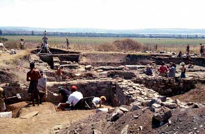In Bulgaria, a Roman fort, probably built to contain a band of federate troops (as opposed to a regular military unit) has been excavated at Dichin. The discovery of this fortress was a great surprise. Andrew Poulter of the University of Nottingham was leading a major Anglo-Bulgarian expedition to investigate the complex problems of how the Roman world came to an end in Bulgaria at the hands, at first, of the Goths in the 4th and 5th centuries, and then of the Slavs at the end of the 6th. He has also been carrying out a major survey of the countryside (using a new technique he has developed) and had chosen what he hoped would be a major village site for large-scale excavation involving almost 200 archaeologists and student volunteers per season. But once he began digging he found that – shock horror – it was not a village at all. The first discovery was a good stout Roman defensive wall, still standing 2m high, with two elaborate Romangateways, a curtain wall, internal towers and an outer defensive perimeter, called a proteichisma. These were not defences belonging to a village but were of such highquality that they could only have been built by Roman military engineers. What was at first surprising was that it did not date to the time of the emperors Diocletian and Constantine, when most impressive late Roman forts were built, but much later, to the very beginning of the 5th century. His team set to work to excavate the interior and the character of the internal buildings was even more surprising.