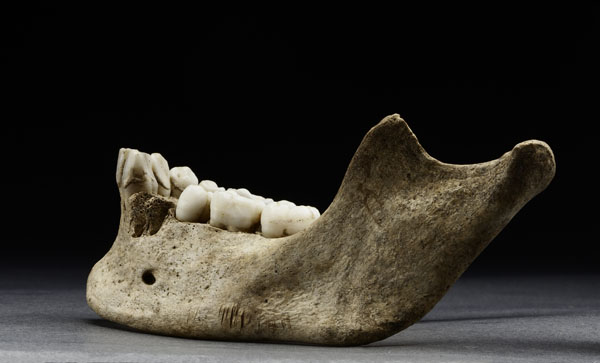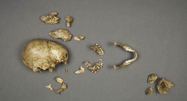 Comprising a fragmentary skull and tibia, the bones were found in a rubbish heap, among discarded rubble and animal remains. Thought to have belonged to a 14-year-old girl, the bones show tell-tale marks indicating that she had been cannibalised.